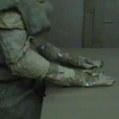 Après de nombreux croquis j'ai opté pour l'idée de « momification » de trois de mes camarades de classe comme une sorte « d'emballage » avec du carton, de la toile de jute, du papier kraft, du raphia et des cordes blanches.