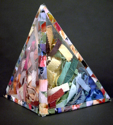 pyramide en plastique contenant des fragments de tissus - 20 x 20 x 28 cm