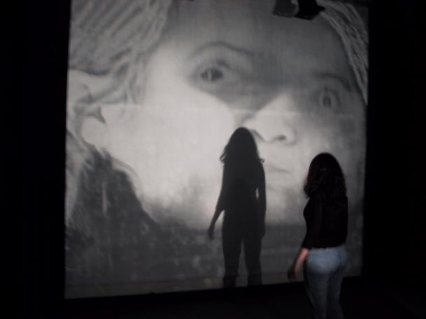 Les photographies ont été prises par une élève de Terminale lors de la performance conçue par Naïla. Les dimensions de la surface de projection sont de 3 mètres sur 4 mètres environ. La performance a duré une dizaine de minutes pendant lesquelles Naïla déambulait (lentement, rapidement, seule ou non) sur une scène située devant la projection.