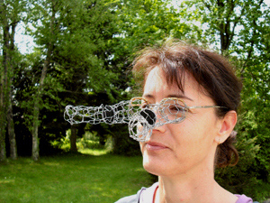 J'ai ensuite voulu faire d'une paire de lunettes, non pas un outil améliorant la vue mais au contraire aveuglant celui qui oserait la chausser : elle est en effet hérissée de plumes métalliques aux pointes acérée (une sorte "d'optique de l'aveuglement").