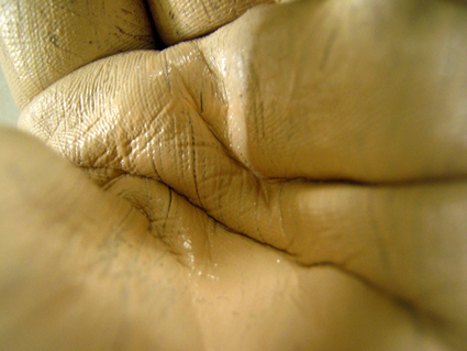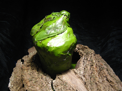 Le corps moulé par la nature Le corps et la nature, un sujet récurrent que nombre de peintres et d'artistes ont étudié. Je suis partie de l'idée du corps moulé dans la nature, la végétation recouvrant l'enveloppe corporelle et remplaçant la peau comme une membrane chlorophyllienne. Pour réaliser cette idée, j'ai fabriqué un masque recouvert d'un mélange de terre, de fleurs et de feuilles séchées, ainsi qu'une composition faite d'un poing feuillu emboité dans l'orifice d'un morceau d'écorce. Les photos ont été prises sur un fond de drapé noir pour accentuer le contraste entre le lissé de la soie et la matière rugueuse des deux objets. La peau se décompose et devient poussière puis humus. On pourrait l'associer aux processus de décomposition que subissent les morts dans leur dernière demeure. Le poing jaillit de l'écorce et s'impose, comme si l'homme voulait échapper au pouvoir croissant de la nature qui commence déjà à reprendre ses droits. Mon projet gravite surtout autour de cette idée de la nature et de la peau, le végétal colonisant l'organique. |