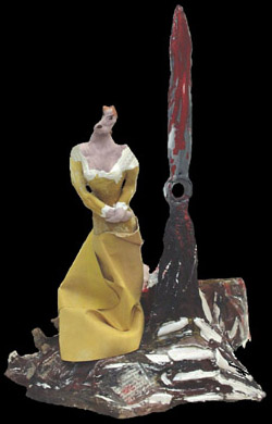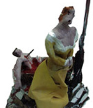 "J'ai fait une partie symbolique et une partie comme sur le tableau. La partie symbolique, c'est, en fait, la dague, la grande dague que j'ai mise et qui est complètement disproportionnée par rapport à Charlotte Corday. Cette dague tenue par une main plutôt squelettique, je pense que c'est la Mort et ce serait cette main qui aurait poussé Charlotte Corday à tuer Marat.