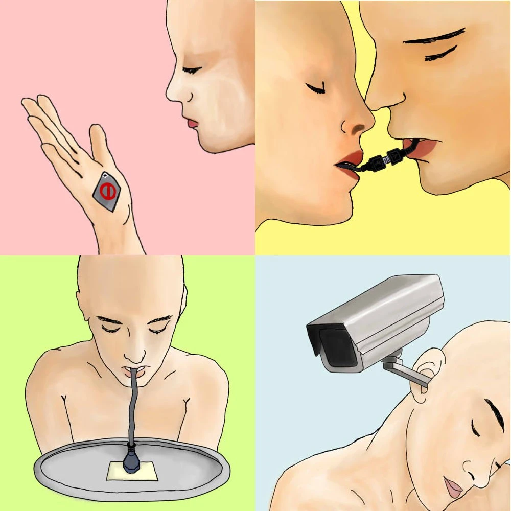 Ses dessins-collages numériques sont imprégnés d'un curieux paradoxe voire de l' « inquiétante étrangeté » prônée par les surréalistes car si l'ambiance acidulée des aplats colorés, l'inclinaison des visages assurent la séduction de l'image, elles diffèrent aussi la perception d'une violente intrusion des nouveaux outils de communication (particulièrement pour « le corps est la machine »).