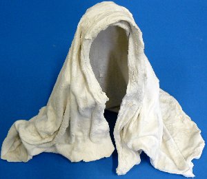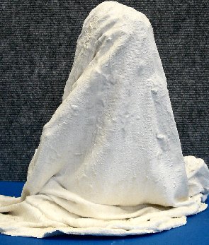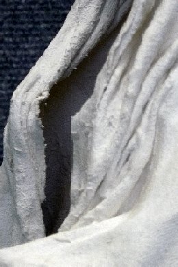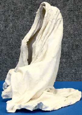 Pour la réalisation suivante, j'ai imaginé un modèle tridimensionnel qui m'a permis de matérialiser le travail en deux dimensions. A partir d'une structure de grillage mise en forme rappelant un humain, j'ai "habillé" d'un tissu imbibé de plâtre. Le grillage a été ôté et il ne me reste qu'une silhouette, celle d'un drapé. J'ai prolongé mon questionnement sur l'absence du corps et la présence des formes.