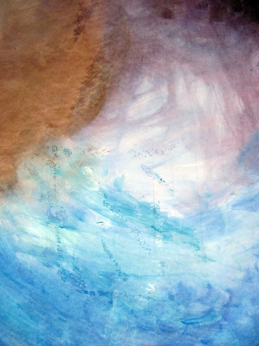 L'autre enjeu, pour tenter de donner une cohérence à l'ensemble, consistait à comprendre et reproduire la facture du peintre. J'ai ainsi essayé de rendre les coups de pinceaux apparents, comme pour les traces nerveuses de vert qui foncent à mesure qu'elles approchent des bords (à la manière des traits sur le visage). A d'autre endroits, j'ai utilisé l'éponge comme outil, de façon à créer des dégradés et des aplats dilués, pour l'arrière-plan en particulier où les couleurs se fondent les unes dans les autres.