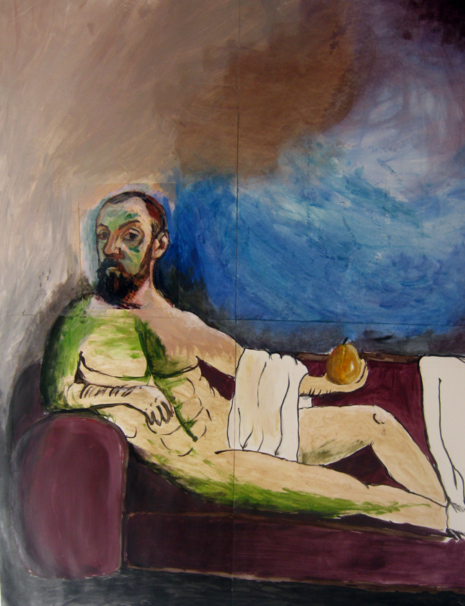 La plus grande difficulté fut sans doute de retrouver les couleurs utilisées par Matisse dans son autoportrait : celles-ci sont à la fois vives (la peinture date de la période fauve du peintre) et subtiles. Il importait de retrouver les mêmes nuances et la même luminosité pour créer la continuité entre le fragment et ma grande peinture : nuances de vert, de violet, de bleu.