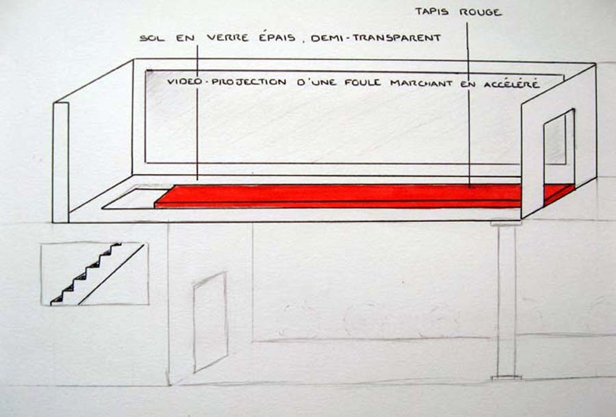Ainsi, créer une pièce constituée d'un sol en verre épais donnant une vue confuse sur la rue située, elle, en dessous de la pièce. Cette rue est la seule source de lumière. Au centre de la pièce, un étroit tapis rouge, symbole du succès, trace une trajectoire obligée et légèrement surélevée. Aux murs, à droite et à gauche de ce passage, deux vidéos-projections d'une foule en mouvement, elles passent en accéléré.