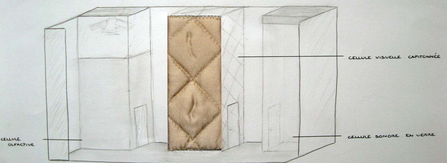 Trois cellules, trois passages pour dessiner les limites sensibles de nos consciences. Une emprise. Prise visuelle, entrer dans une cellule capitonnée et être aveuglé par une série de flashs soudains.