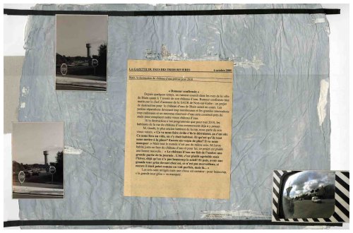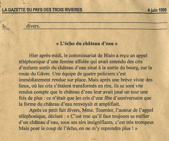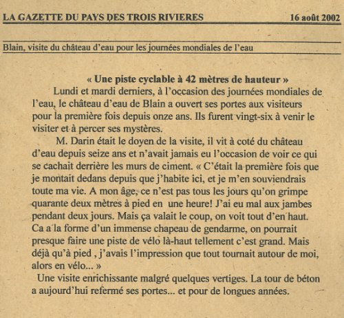 Petit à petit, l'histoire du château d'eau a commencé à se dessiner, de sa construction jusqu'à aujourd'hui. J'ai rassemblé les commentaires et histoires accumulés au cours de mes visites. L'idée de reconstituer cette histoire sous forme de faits divers relatés par une gazette locale s'est imposée d'elle-même. Mais il me manquait toujours quelque chose : la fin de l'histoire, la chute du récit. Le château d'eau avait eu une naissance et une vie, il lui fallait une mort. J'ai alors décidé de lui en fabriquer une. En parlant de cette destruction avec les habitants, j'ai compris que certains, ceux qui vivaient là depuis longtemps, étaient réellement attachés au château d'eau, qu'ils se l'étaient en quelque sorte approprié. Non, le château d'eau de Blain ne sera pas détruit en 2010 ! Mais sa silhouette familière traversera-t-elle le siècle ?