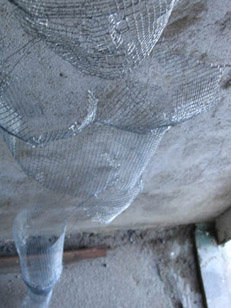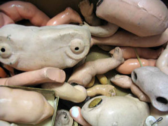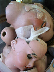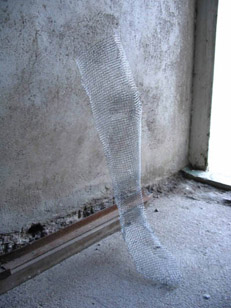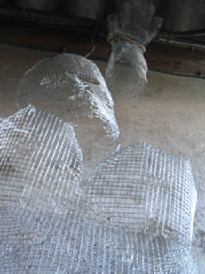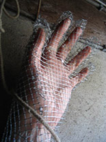 Je me suis imprégnée dans un premier temps de l'univers familier de l'atelier de ma sœur (réparatrice de poupées) et j'ai donc pris des photographies considérées comme recherches pour le projet futur de prise d'empreintes de mon corps. Ces photos-traces m'ont aidé à développer ma réflexion sur l'image d'un corps démenbré et reconstitué puis à retenir le grillage comme matériau pour conforter l'idée de présence-absence de cette image corporelle.