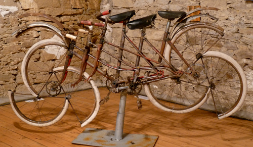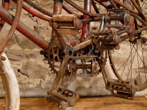 Nous voulions "mettre en action" un objet dans l'espace et le temps. Par chance, nous avons déniché trois vélos presque identiques dans une déchetterie. Après les avoir démonté, découpé, puis ressoudé, nous avons tenté de retranscrire la dimension cinétique propre à leur déplacement. Notre travail est une forme de clin d'œil aux Futuristes italiens (Boccioni, Dynamisme d'un cycliste, 1913) et à Arman (Solex, ici et là, 1989) mais aussi à Duchamp (Roue de bicyclette, 1913).