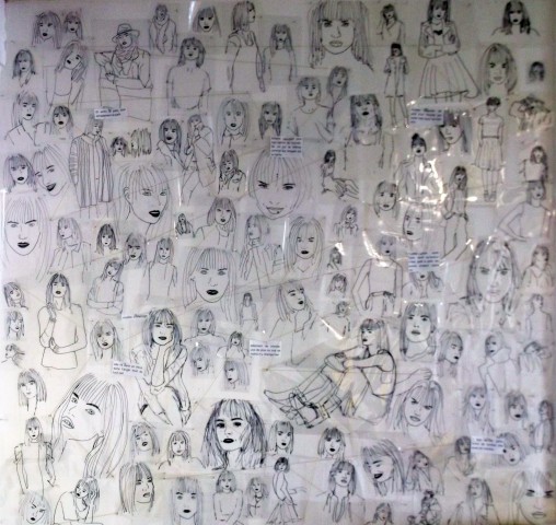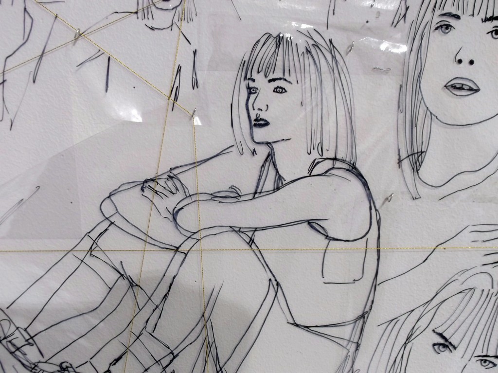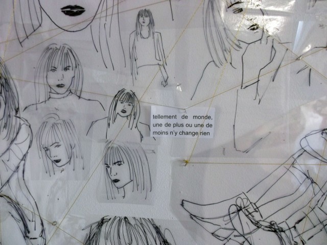 Pour ce projet, j’ai réalisé une accumulation de visages avec un élément récurrent : la coupe de cheveux au carré. J’ai utilisé l’image que je me suis faite de Muette et l’idée qu’un seul visage ne lui correspondait pas, mais qu’elle était une multitude de personnes, de visages et d’identités. J’ai développé ces recherches autour d’un visage comme on mène une enquête. Il m’a semblé que cette production pouvait être une sorte de tableau d’investigations, les images étant reliées les unes aux autres via un fil rouge. J’ai également ajouté aux images des citations du roman qui renvoient aux phrases que les parents de Muette lui répétaient.