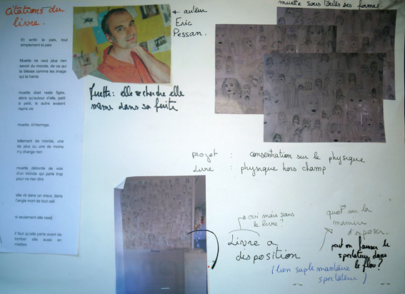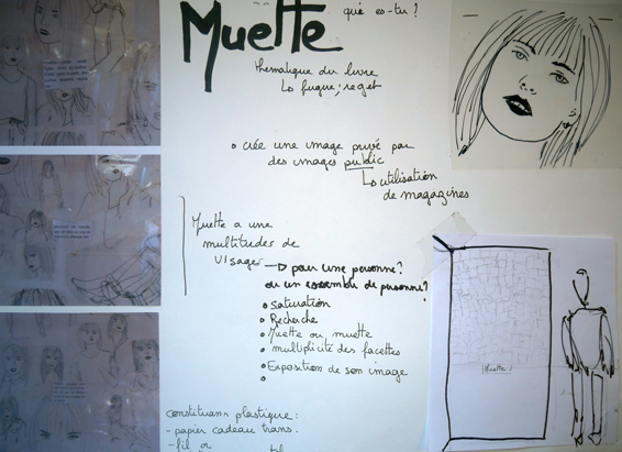 Julie a découvert Muette, le roman d'Eric Pessan, sur l'un des rayonnages du CDI. Séduite et touchée par la lecture du livre, elle a décidé que celui-ci et son personnage principal, une adolescente fugueuse nommée Muette, seraient le point de départ d'un projet plastique qui va se décliner avec une grande liberté sous différentes formes.