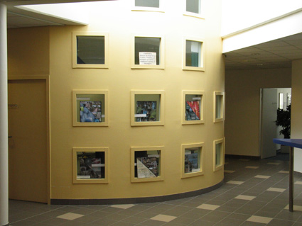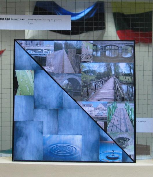 J'ai, dès le départ, eu envie de jouer avec les petites fenêtres de la salle de réunion que tout le monde appelle «l'aquarium», car cette pièce du lycée ressemble à un bocal en verre... Mes six travaux sont alternativement disposés devant et derrière les vitres, passant ainsi de l'intérieur du «bocal» vers l'extérieur, et vice versa. Pour brouiller les pistes - et pour créer un effet poétique - j'ai décidé d'intervertir les définitions qui m'avaient pourtant servies à fabriquer mes images. Ainsi, le «passage de Venus sur le disque du soleil» se trouve associé à un escalier recouvert de moquette rouge. C'est donc à celui qui regarde de recréer les liens défaits. »