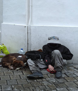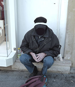 Quatre photos de jeunes SDF, prises de façon frontale, dont le visage a été effacé. Mes photos tentent d'exprimer le "non être" de ces individus confrontés perpétuellement à la foule. Mon questionnement s'est déclenché à partir de cette ambigüité entre l'altérité et l'indifférence. Ce qui me surprend, c'est la façon dont on passe régulièrement (c'est en fait sur mon trajet quotidien pour me rendre au lyçée) sans s'en apercevoir ou sans prendre le temps de percevoir la personne en question.