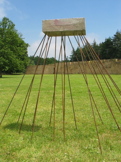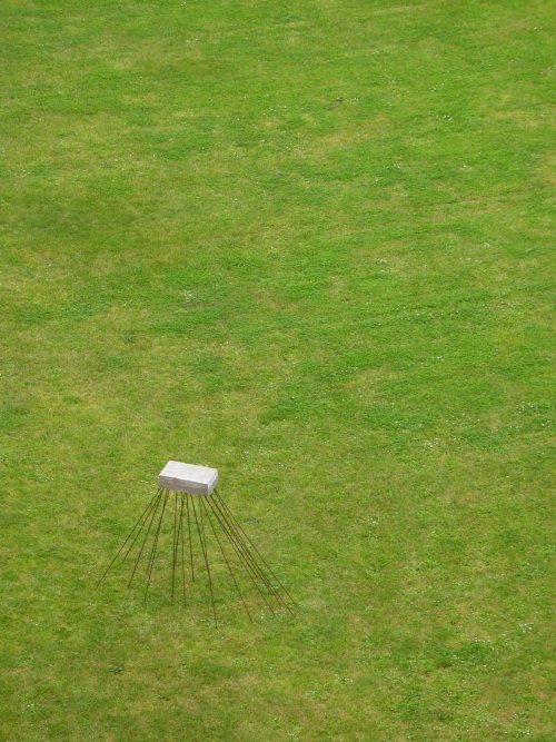 Ma sculpture, à échelle humaine, est fondée sur cette relation : les rayons métalliques évoquent l'ancrage de l'homme au sol comme autant de racines puisant leur énergie vitale. Ces tiges, figées aléatoirement dans le bloc de béton en suspension, créent une certaine dynamique et marquent l'espace au sol.