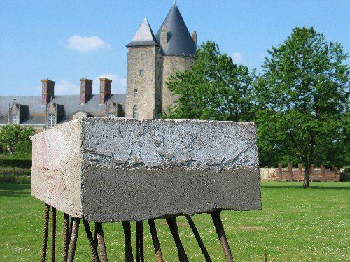 Pourtant chez Maxime, le matériau résiste, la masse est encore là, bien présente, sous la forme d'un socle renversé, hissé à la hauteur du regard. Ce bloc de béton en suspension, malgré son poids (environ 70 kilos), questionne paradoxalement la notion de légèreté. "Michael Fried, évoquant les sculptures d'Anthony Caro, parle "d'apesanteur accomplie". Un type d'apesanteur qui caractérise la tradition de la sculpture non-monolithique qui s'est développée à partir du collage cubiste. L'originalité du style de Caro consiste en partie à nier le poids en abaissant et en élevant les éléments de la sculpture qui le signifient." (Clément Greenberg cité in Britannica. 30 ans de sculpture, La Différence, 1988, p. 94).