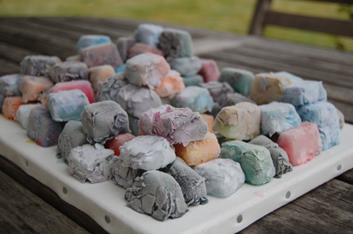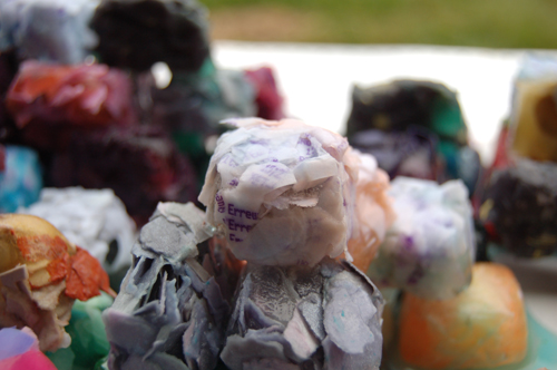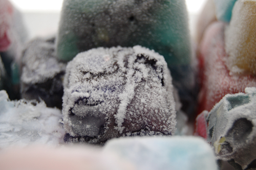Pour réaliser ce travail, j'ai déchiré des papiers en très petits morceaux, puis je les ai plongés dans des encres colorées. J'ai congelé le tout dans des bacs à glaçons.