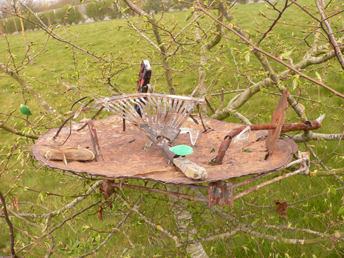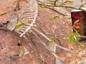 La sculpture, dont le socle est un grand disque de métal rouillé percé d'entailles, s'organise principalement autour de deux éléments : un vieux râteau de jardinier et une scie circulaire à dents courbées. Toute une série d'objets au premier abord hétéroclites - bois flotté, boîte de peinture, débris de verre et de miroir - y ont été associés et gravitent autour de ces deux éléments. De petites feuilles en aluminium colorées en vert viennent parsemer le socle.