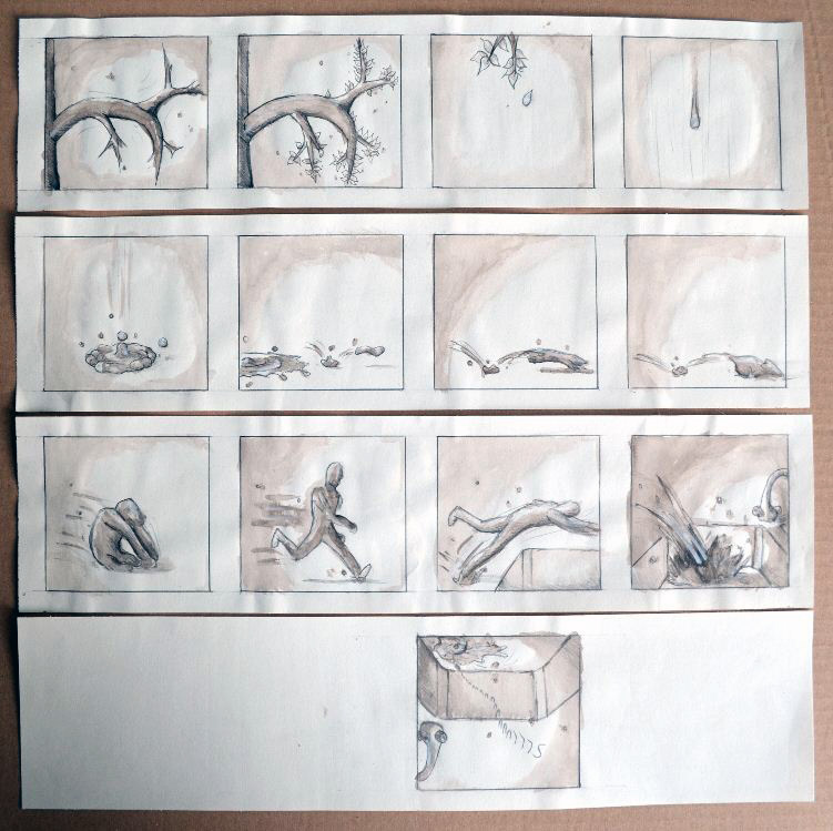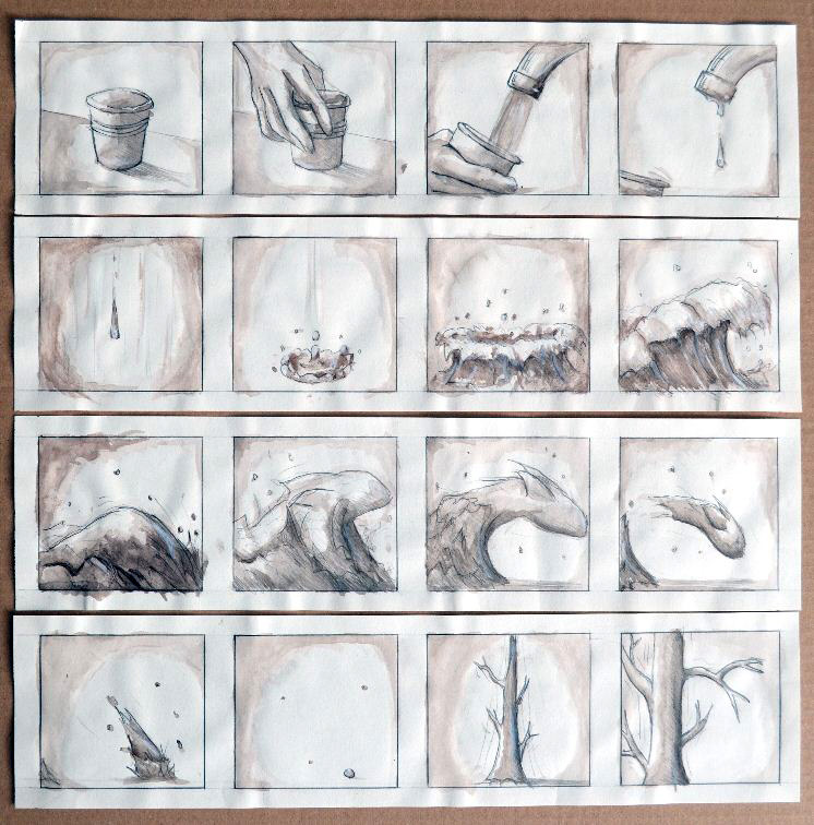 A la base ce projet était destiné à l'exploration d'une thématique, l'eau, à travers un ou plusieurs supports, mais je me suis progressivement dirigé vers quelque chose de plus simple et cohérent qui se limiterait à un seul médium. L'idée était donc de créer une histoire autour de l'eau - et surtout de la relation que l'homme peut avoir avec - d'où le choix de réaliser un film d'animation, ce qui permet d'allier l'image, le mouvement et le son et ainsi obtenir un propos, à mon sens, plus évocateur. L'histoire devait se dérouler globalement en trois parties : 1 : l'ouverture sur un usage courant, anodin de l'eau au quotidien, puis 2 : partir de cette action pour créer une imagerie fantastique, voire poétique autour de ce que l'eau peut évoquer dans nos sociétés (la pluie, les vagues, l'océan, les cycles, la vie...) et 3 : couper net à cette « rêverie » et montrer à travers une autre action banale l'usage abusif et le gaspillage de l'eau par l'homme (question de l'écologie).