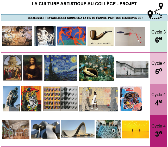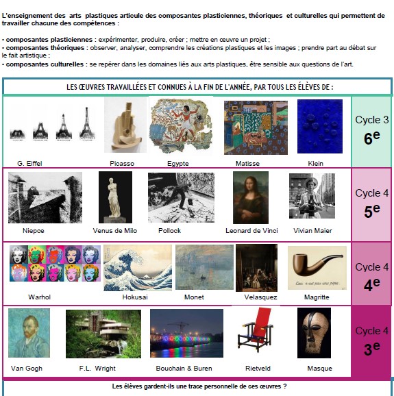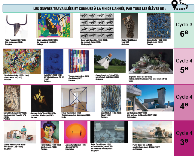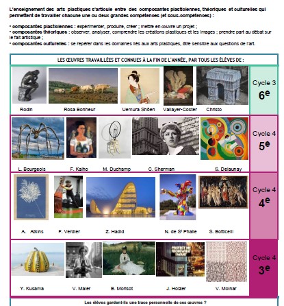 Nous faisons ici l’hypothèse que s’appuyer sur la culture artistique à partir notamment d’un nombre restreint d’œuvres d’art (5 par niveau, de la 6eme à la 3eme, semble trés raisonnable et réaliste) à faire re-connaitre aux élèves est un gage de réussite pour assurer la continuité, la cohérence et la progression quel que soit l’enseignant qui a en charge les classes pendant une année.