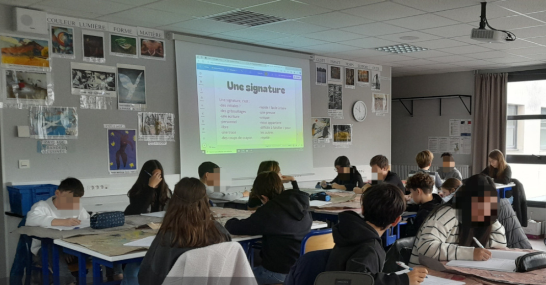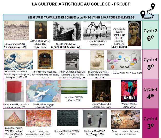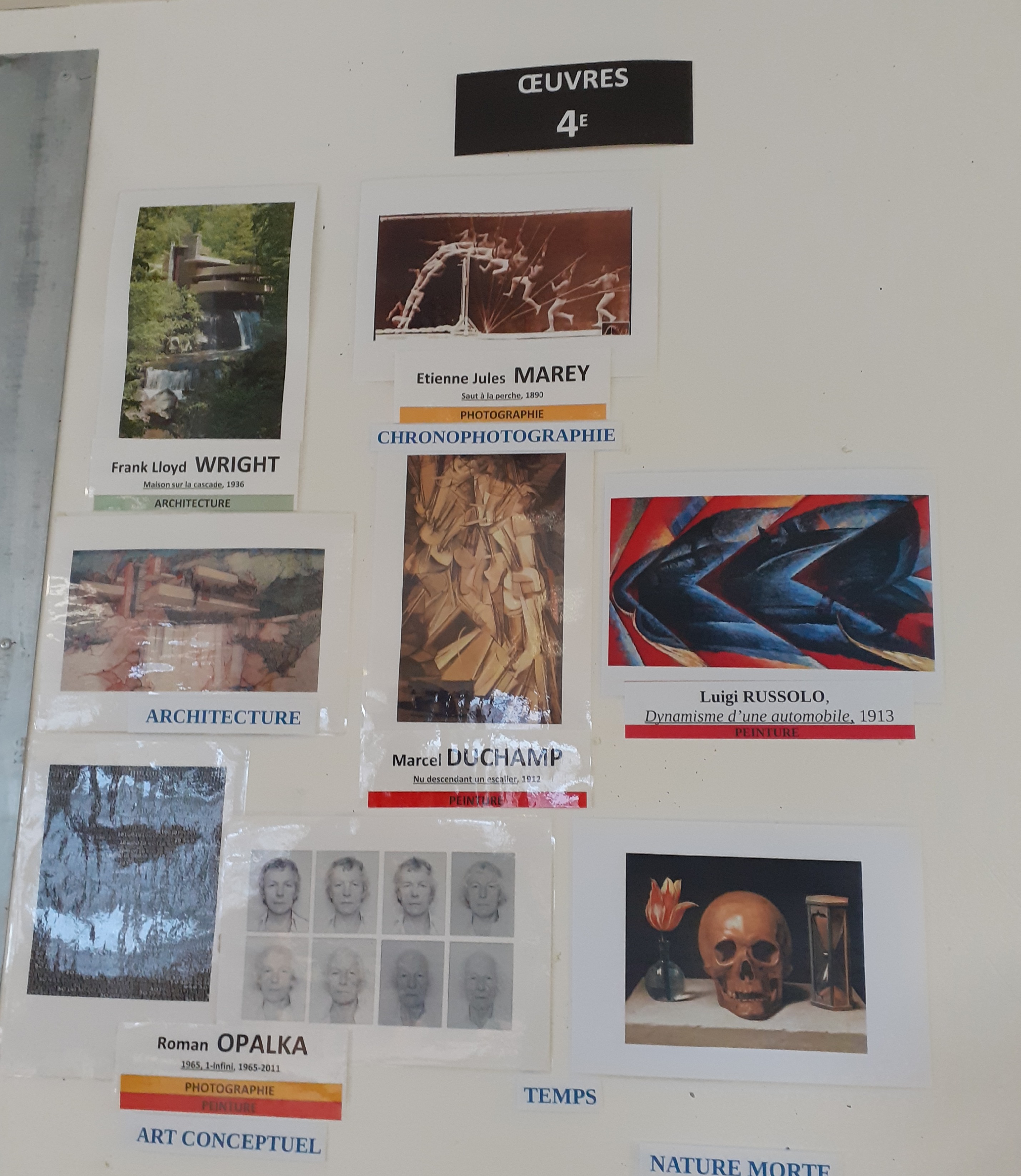 Un projet d'enseignement d'une vingtaine d'oeuvres de reférence entre en écho avec leur présentation au mur de la salle, dans un espace dédié à la culture artistique dans la salle d'arts plastiques mais aussi à l'exterieur, dans la salle de cours d'une autre discipline ( histoire, français...), au CDI, dans la salle des professeurs.