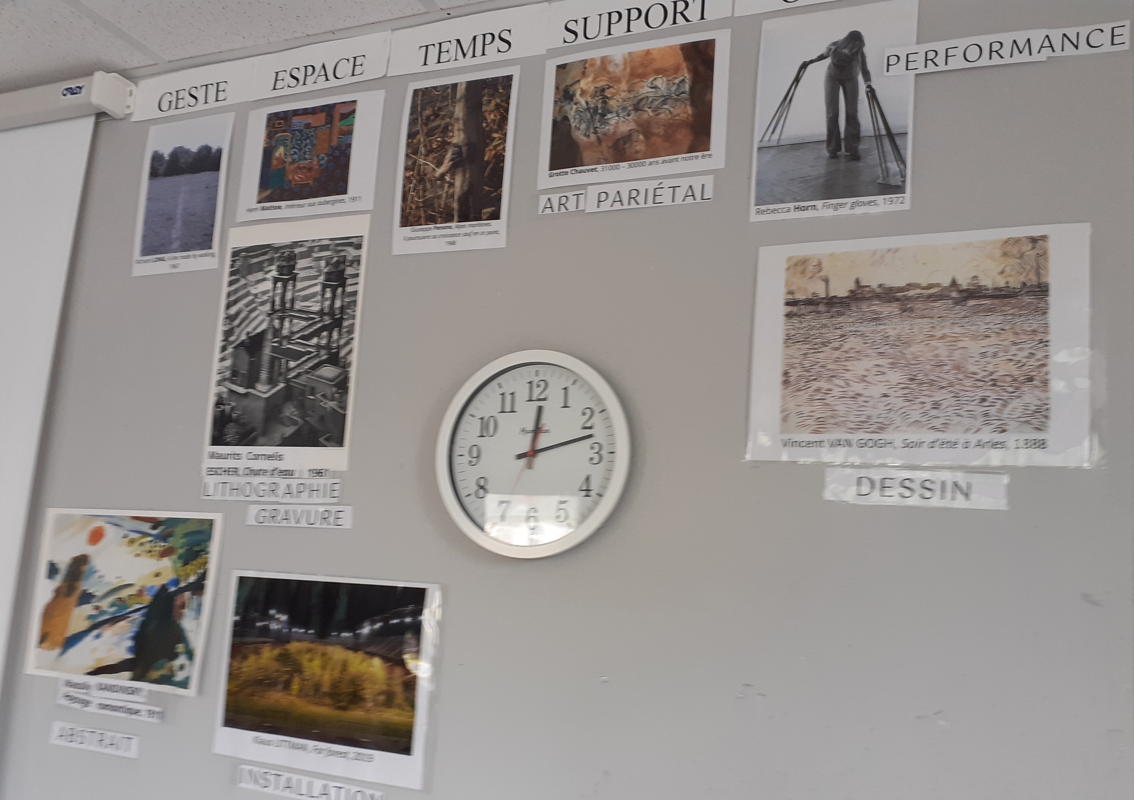 Une fiche projet d’enseignement permet à chaque équipe de formaliser un parcours en termes de culture artistique. En écho aux objectfifs partagés, les reproductions d’œuvres qui attestent d’un regard permanent de la part des élèves, sont affichées sur les murs de la salle commune.
