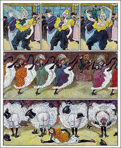 La Bande dessinée restitue la vie vie de Toulouse-Lautrec : ses rencontres artistiques, le Moulin Rouge, Montmartre….