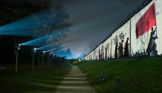 L'invitation commune par le Eye Filmmuseum d'Amsterdam, dont un des espaces de présentation intérieur offre une configuration de murs suivant une ligne brisée (photo à gauche), et par le Lichtsicht-Projection Biennale de Bad Rothenfeld en Allemagne qui dispose d'un "mur écran" en plein air de 412 mètres de long, composé d'empilements de fagots servant à la récolte du sel (photo à droite), conduit William Kentridge à imaginer une œuvre (More Sweetly Play the Dance, 2015) s'adaptant à ces deux dispositifs de présentation très différents dans le rapport que le spectateur entretient à l'image et au son (vision pouvant éventuellement englober plusieurs écrans dans le premier cas et son plus intime, forcément fragmentaire pour le deuxième étant donné la longueur).