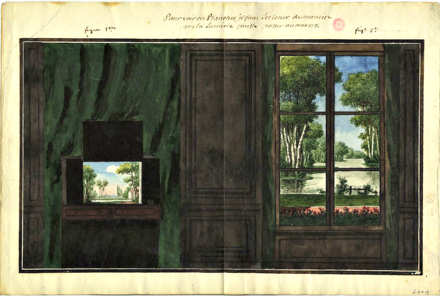 Carmontelle Mémoire sur les tableaux transparents du Citoyen Carmontelle, 1794-1795, planche gouachée des essais de faire breveter ses transparents