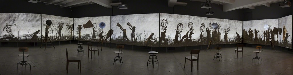 William Kentridge More Sweetly Play the Dance, 2015 Installation vidéo de 8 canaux et 4 mégaphones, son - HD vidéo 1080p / ratio 16:9, durée 15 minutes, vue de l'installation à la Marian Goodman Gallery de New York en 2016