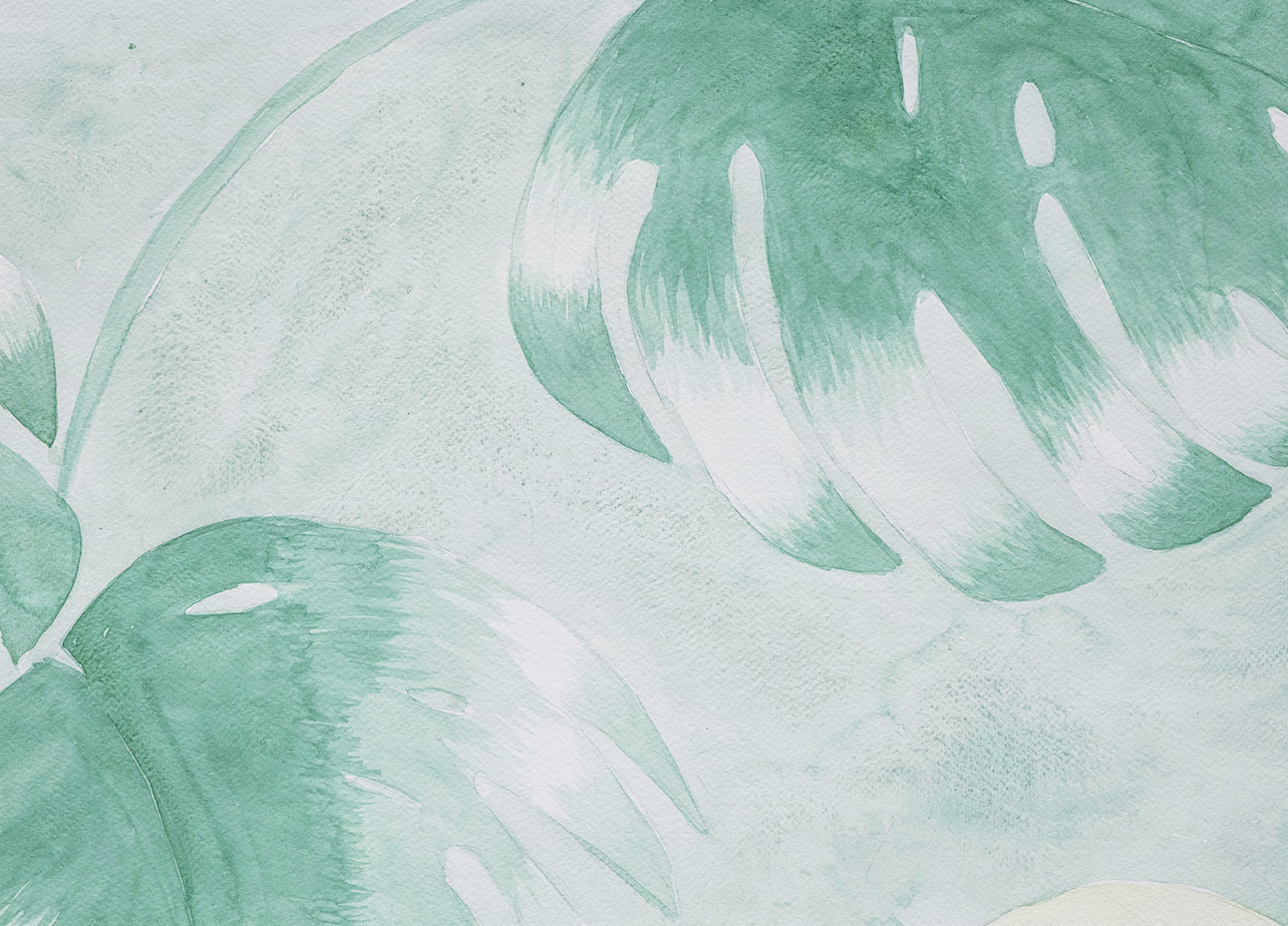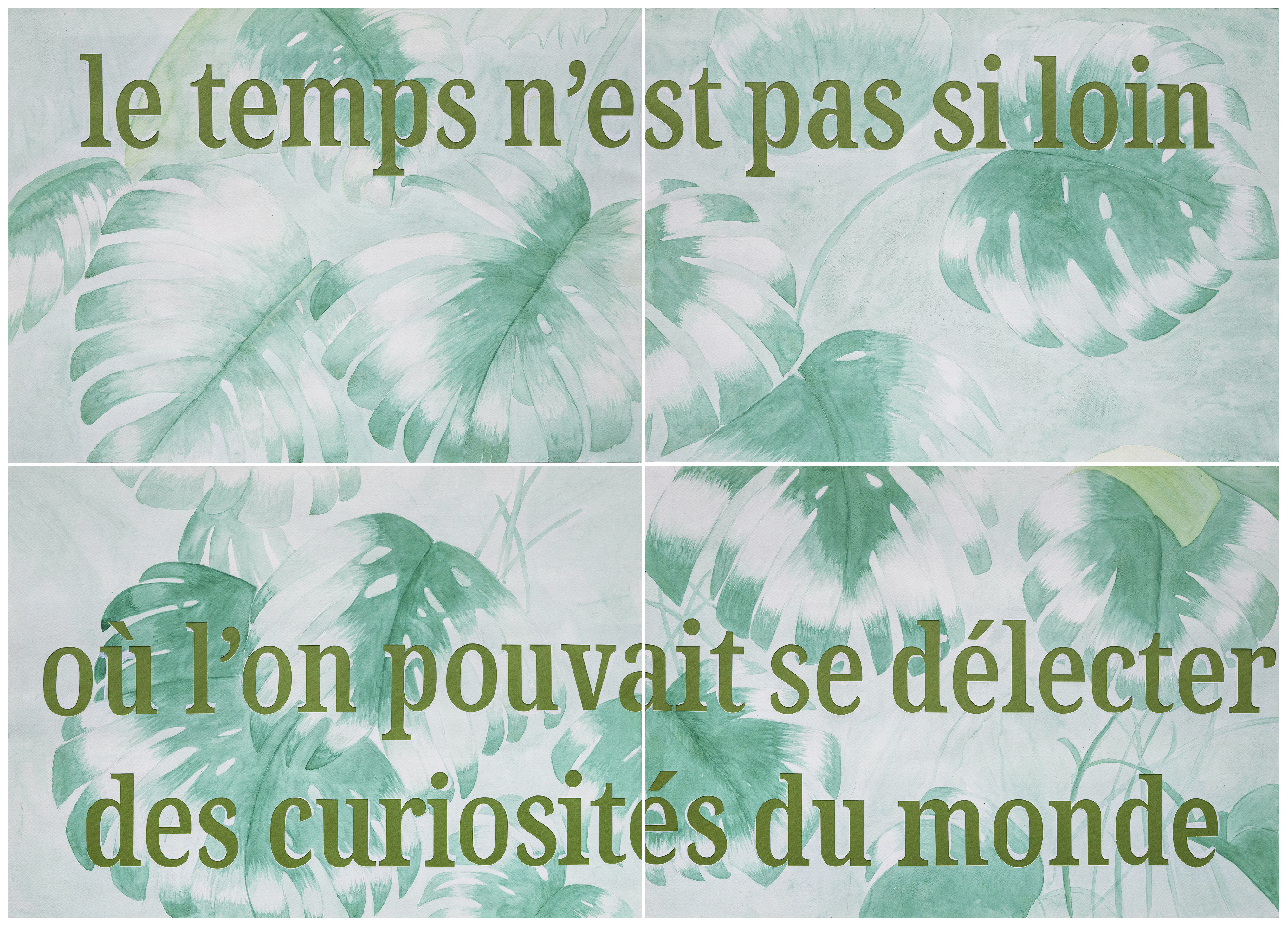 J'avais en tête de reproduire une photographie que j'avais faite du « Jardin Extraordinaire », un lieu qui se trouve à Nantes, car je trouvais qu'il composait un bon mélange entre la nature (c'est un jardin) et le futur, en raison de sa construction artificielle et toujours en devenir. Mais j'ai finalement décidé de représenter simplement des philodendrons monsteras – des plantes que l'artiste Sam Szafran avait l'habitude de peindre aussi à l'aquarelle – dans un camaïeu de verts, sur quatre grandes feuilles de 50 x 70 cm.
