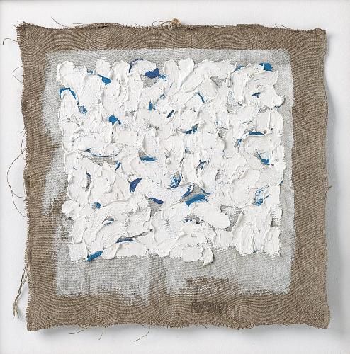 A New-York, dès 1952, son emploi de gardien au MoMA permet à R.Ryman de se familiariser avec Matisse et Rothko, qu’il considère comme peintres de méthode. De 1957 à 1962, il exécute différentes peintures, expérimentant sur des supports et avec des techniques variés, l’huile, la gouache et la caséine. (...) Car la question que pose alors Ryman n’est pas tant celle de la structure du tableau que celle des composantes de la peinture. Le blanc y occupe de fait une place presque exclusive, « couleur neutre qui permet une clarification des nuances dans la peinture (et) rend les autres aspects de la peinture visibles, qui ne seraient pas si claires avec l’usage d’autres couleurs ». Entre 1961 et 1962, Ryman réalise de petites toiles sur des supports de lin non tendu. La toile est partiellement recouverte d’un aplat blanc lui même saturé d’un épais entrelacs de touches blanches, à travers lesquelles transparaît un fond de couleur bleue permettant à la matière une intense vibration. (...) Ryman rappelle « qu’il n’est jamais question de « que peindre », mais de « comment peindre » ».