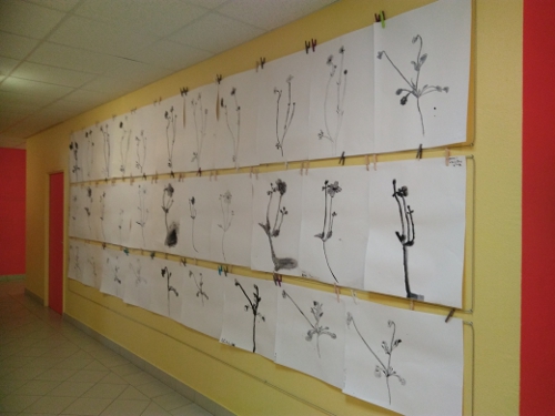 Mini-galerie du collège René Char, Saint-Joachim (44). Accrochage des travaux des élèves de monsieur Le Bris, professeur d'arts plastiques.