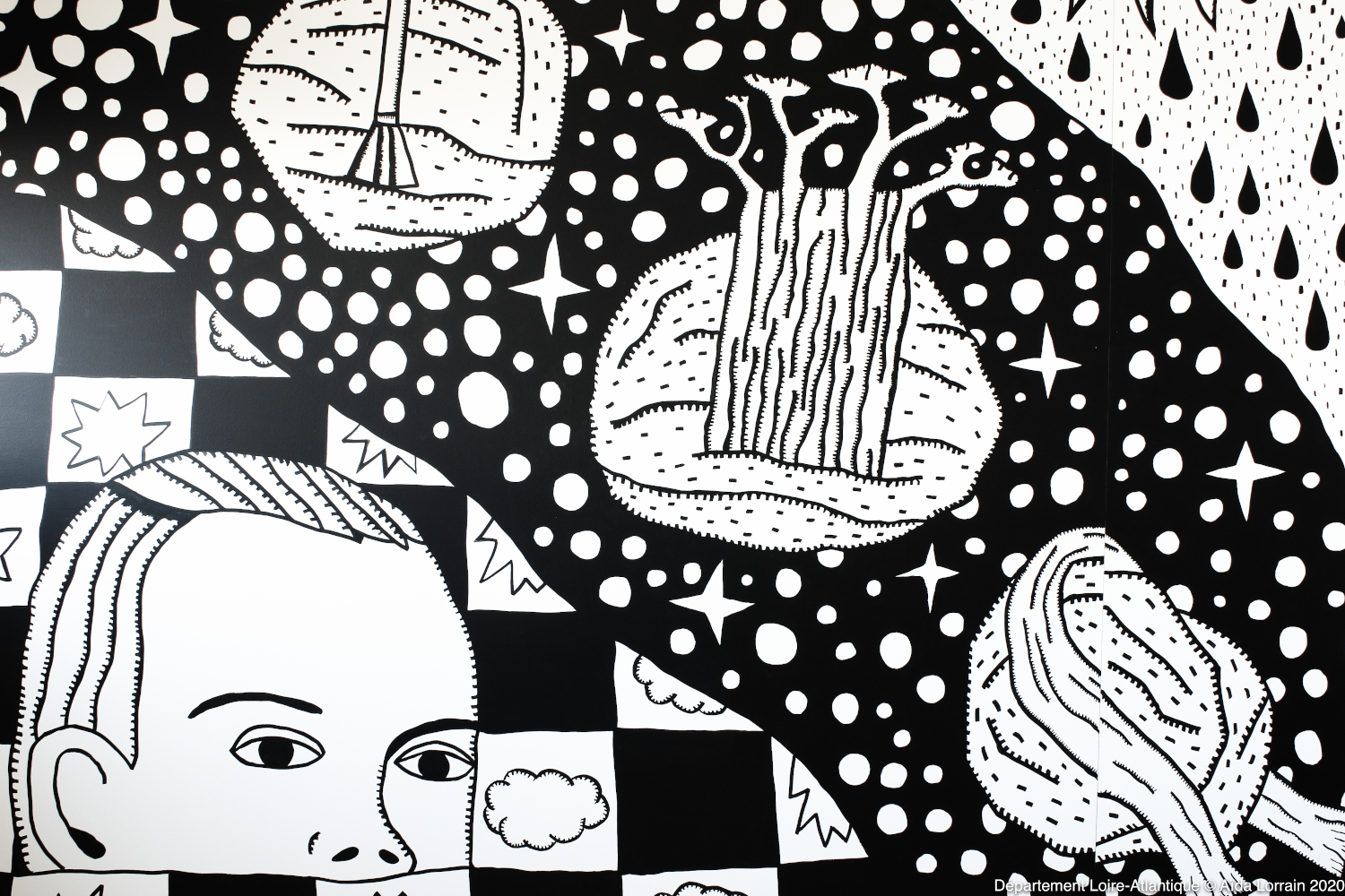 Seules deux couleurs sont présentes sur la composition d’Hector de la Vallée : le noir et le blanc. Les formes et objets dessinés en positif ou négatif produisent du contraste. L’alternance du jour et de la nuit donne l’impression que l’avion, élément central, voyage d’un univers à l’autre. Tout ce que l’on voit semble uniforme. Pourtant le noir et le blanc forment parfois, grâce à l’épaisseur et la distance entre chaque trait, un gris optique.