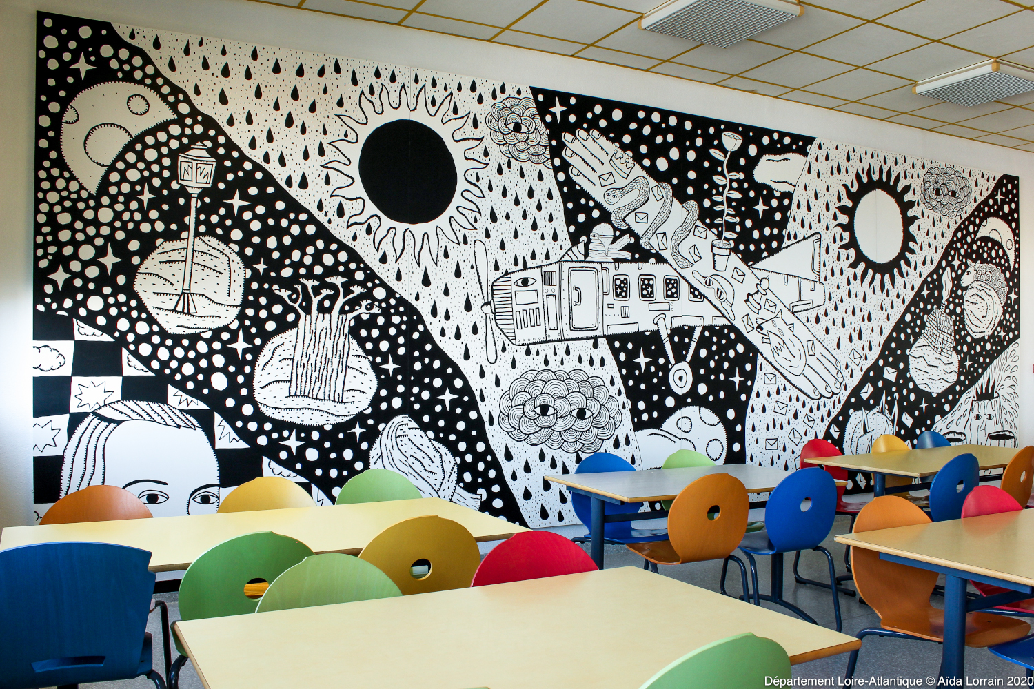 "Intitulée « Antoine », en référence au prénom de Saint-Exupéry, auteur qui donne son nom à notre collège, son œuvre gigantesque composée de 4 panneaux de bois de 8 mètres sur 2 mètres 80, est un dessin aux feutres et acrylique. Pour la réaliser, il s’est plongé dans la vie et l’œuvre de l’auteur en écoutant des émissions de France Culture à la radio. C’est sur 4 feuilles A4 collées entre elles qu’il a crayonné son croquis. Celui-ci a ensuite été dessiné par Hector sur les 4 panneaux de bois, dans un des hangars de l’île de Nantes, prêté par une association, et ont enfin été accrochés aux murs du self. Certains éléments, plus difficiles à réaliser ont été projetés. L’artiste explique avoir mis une semaine pour croquer son dessin et environ un mois pour le réaliser en grandeur nature. L’accrochage dans le self a quant à lui pris 2 jours.