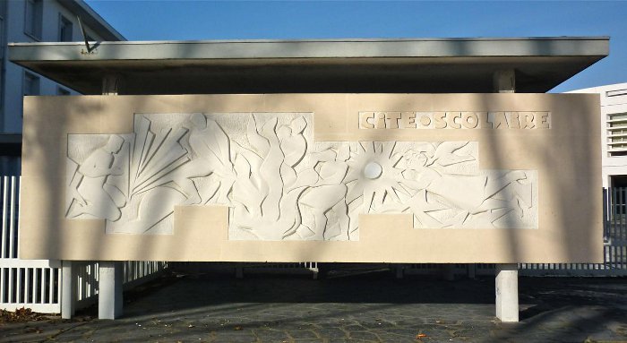 Au sortir de la seconde guerre Mondiale, au moment de la reconstruction de la ville de Saint-Nazaire, le chantier de la cité scolaire devient un laboratoire pour les étudiants de l’Ecole des Beaux-Arts de Paris mais ce sont finalement les professeurs qui réalisent les oeuvres. Fleurissent ainsi plusieurs œuvres qui ornent désormais les divers espaces, parcourant les allées et autres murs des bâtiments. Cinq œuvres sont aujourd’hui répertoriées dont le bas-relief de l’entrée qui évoque de manière allégorique l’utopie de la réunion du travail intellectuel et manuel.