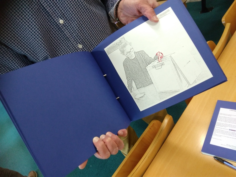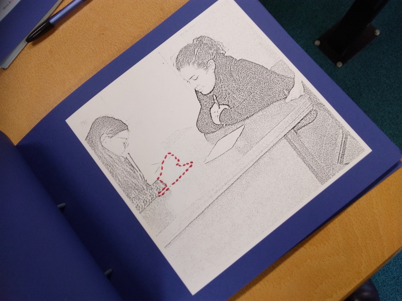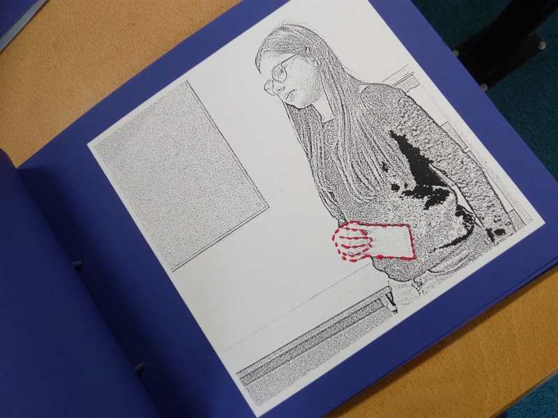 Nous avons ensuite beaucoup réfléchi à la présentation de ce travail photographique. Nous aurions souhaité présenter les images, les unes à côté des autres, encadrées sur un mur. Cela aurait pu faire un ensemble de 5 cadres sur 5 lignes par exemple. C'est ce que nous avons fait pour présenter notre projet aux portes ouvertes fin mars. Cela permet de mieux voir l'ensemble mais comme nous devions envoyer notre travail par la poste, cela aurait fait un peu lourd....d'où l'idée du livre !