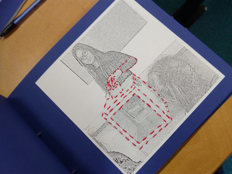 A partir de toute cette liste, nous nous sommes demandé de quelle manière nous pourrions représenter tout cela. Nous avons réalisé des croquis afin de mieux partager nos idées avec nos camarades et connaître leurs avis. L'idée de réaliser des photographies de mises en scène d'«actes citoyens » a été très vite retenue. L'idée de transformer les images avec le logiciel GIMP est rapidement arrivée car cela permettait d'avoir des images homogènes mais aussi de moins identifier les personnes pour que tout le monde puisse se reconnaître un peu dans ces actes. Comme nous voulions insister sur les « actes », nous avons eu l'idée de les souligner avec de la couleur. Nous avons donc utilisé du fil rouge que nous avons cousu sur le papier. Très vite, nous avons pensé à reprendre les couleurs du drapeau français et donc de coller l'image sur un papier bleu !