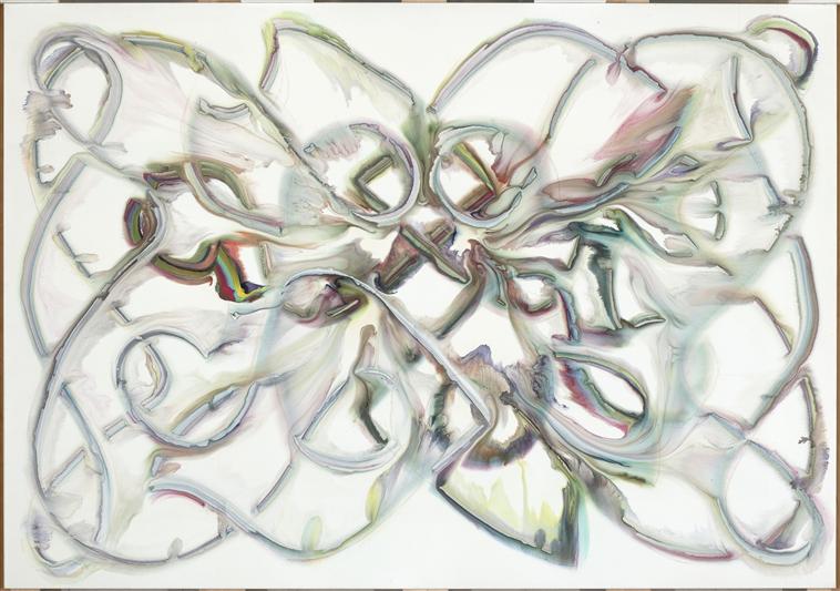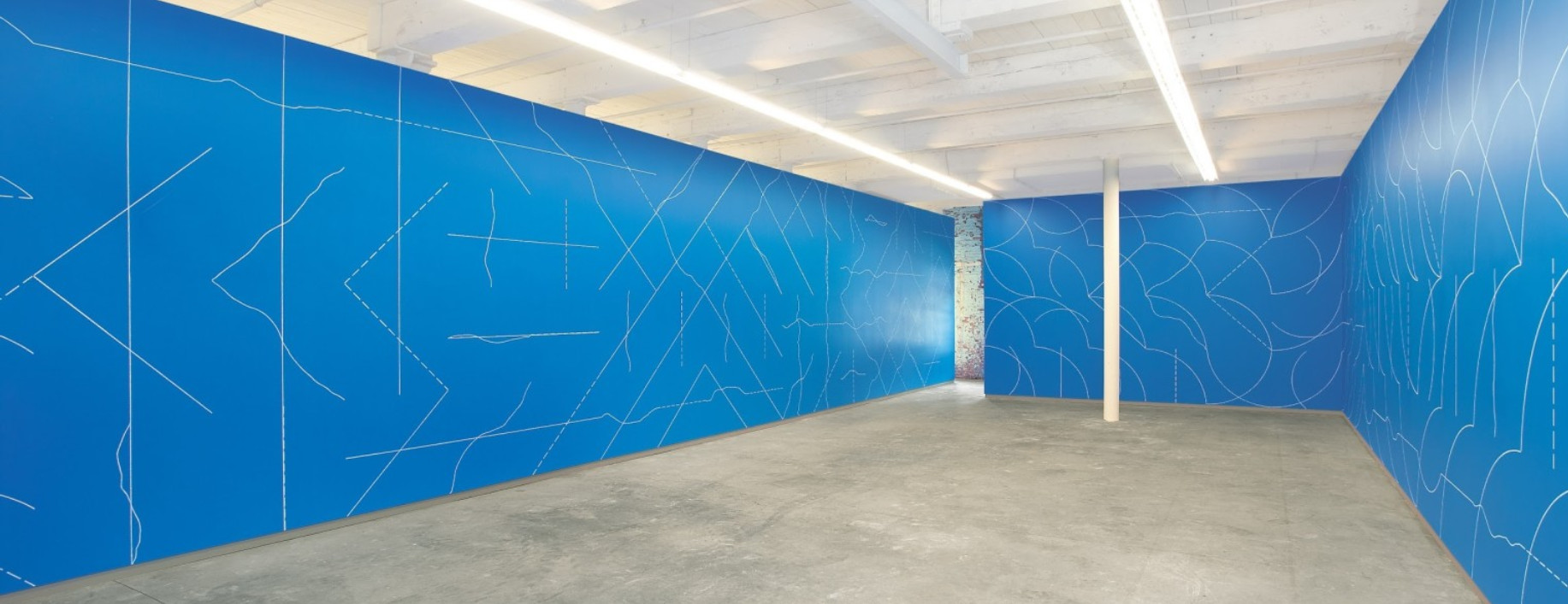 Combinaisons d'arcs sur une trame de 90 cm, crayon noir et blanc sur mur bleu