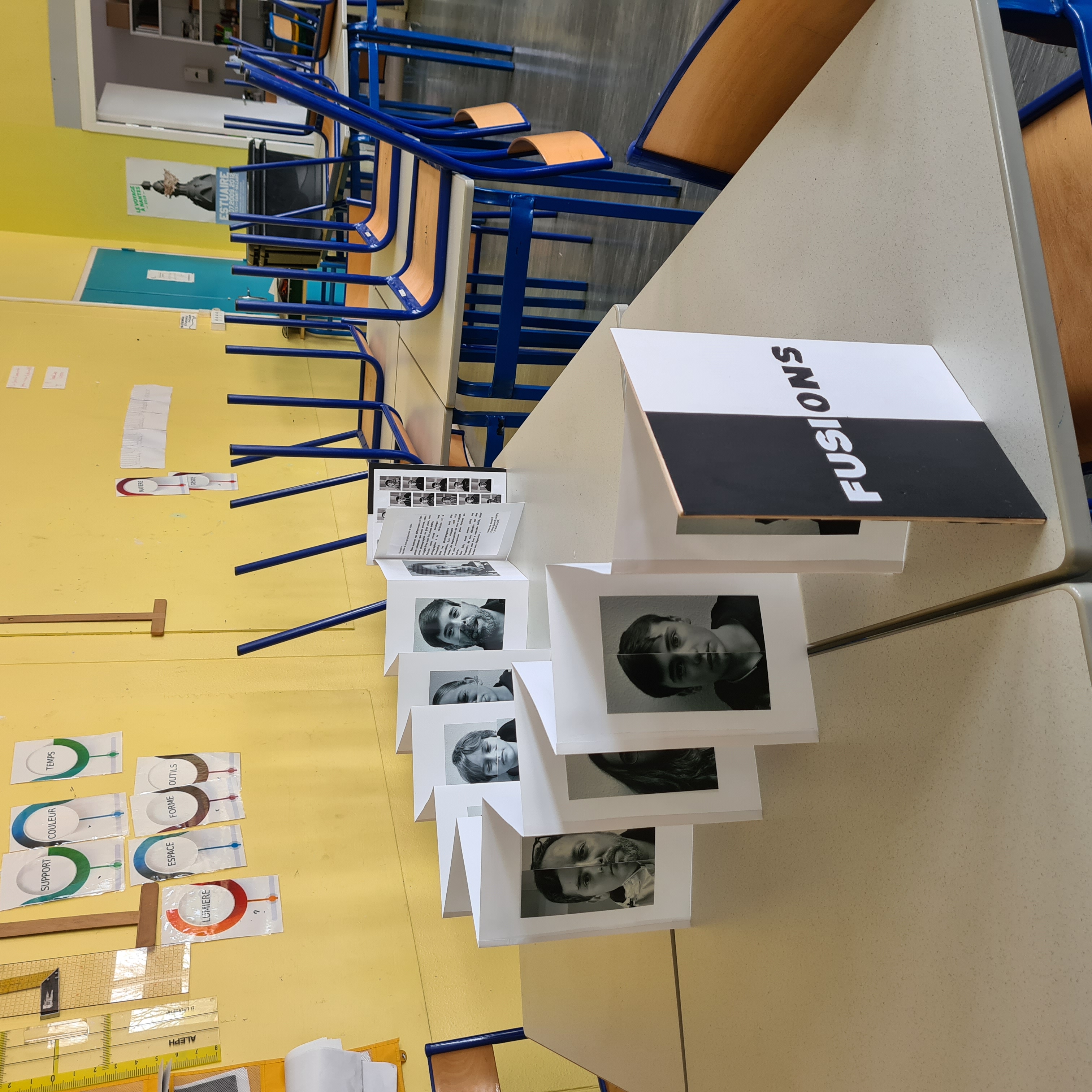 Les photographies imprimées, certains préparent les découpes, d’autres le montage des photographies. Des formes variées de livre sont présentées aux élèves. Ils retiennent « le leporello » car il montre les deux formes de « fusion » simultanément. Le déploiement en recto verso donne aussi un caractère plus sculptural à l’ensemble.