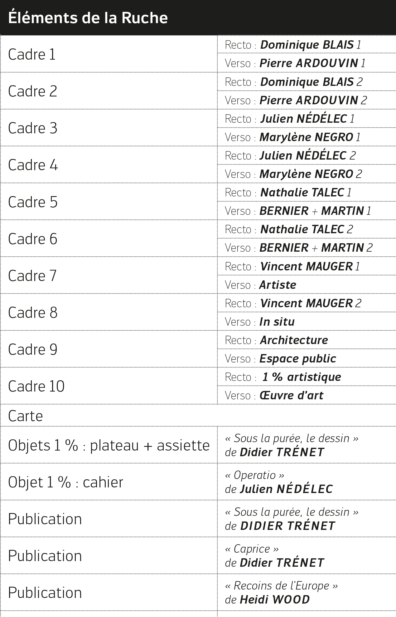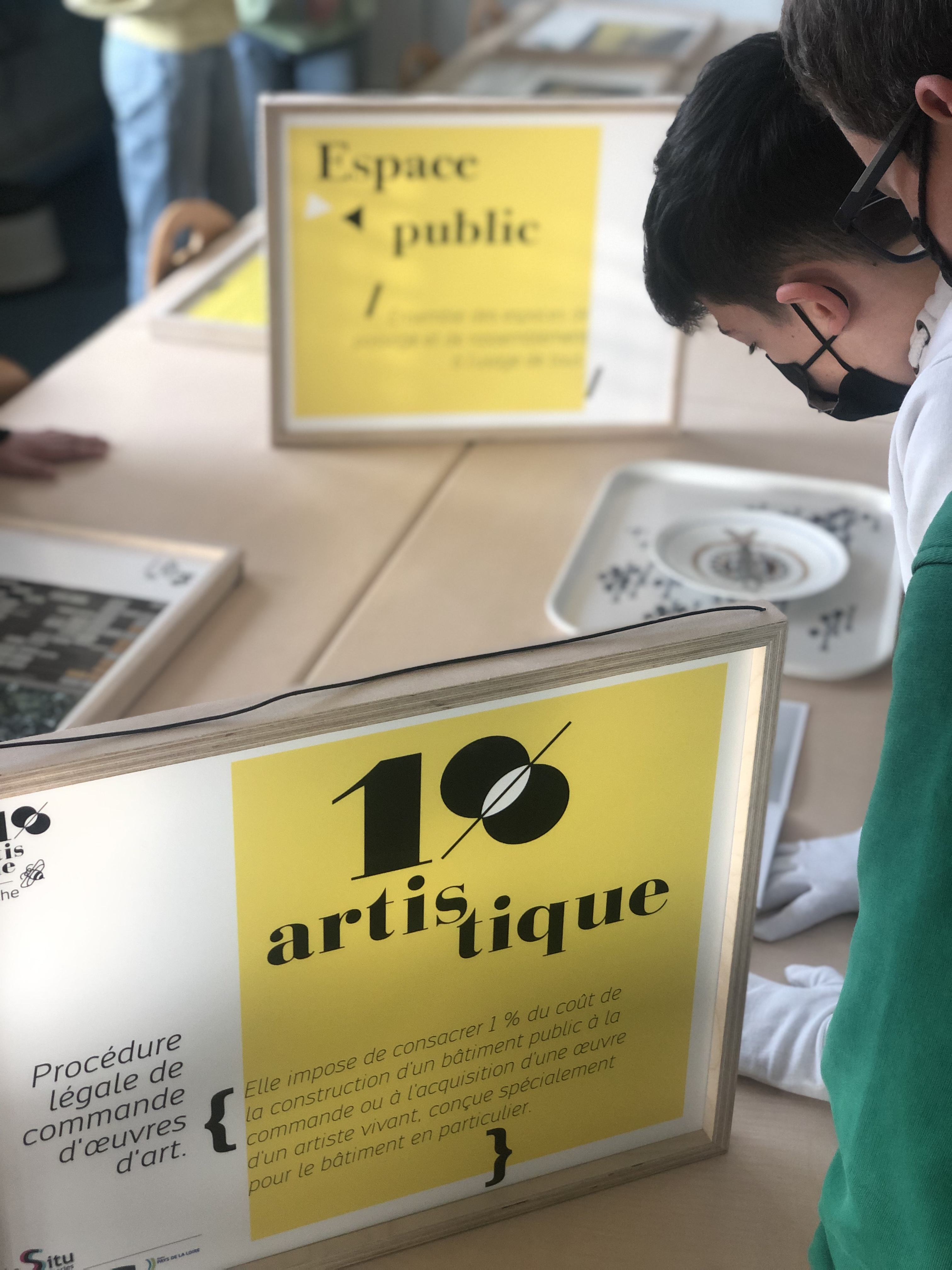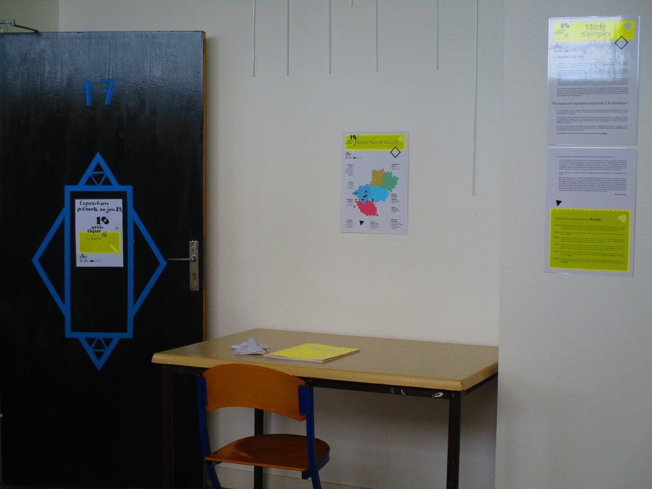 Le Kit dénommé la RUCHE donne la possibilité aux établissements scolaires de la région de s'offrir une exposition thématique et artistique autour de la question du 1% artistique. Ce dispositif itinérant permet de répondre aux demandes institutionnelles cherchant à valoriser, à chaque rentrée, les 1%.