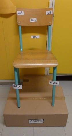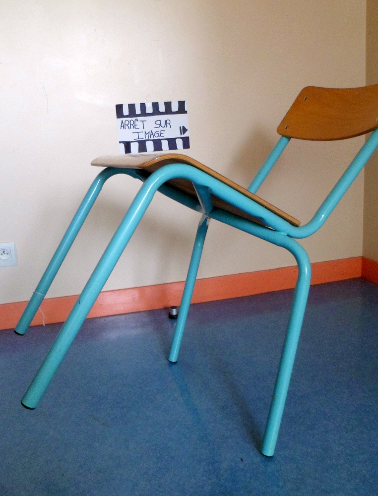Étienne-Flavien : « Inversion des rôles - Nous avons voulu représenter une chaise sur une table car normalement c'est l'inverse : c'est la chaise qui est sous la table. La fonction des mots est de donner un sens à « l'œuvre ». »