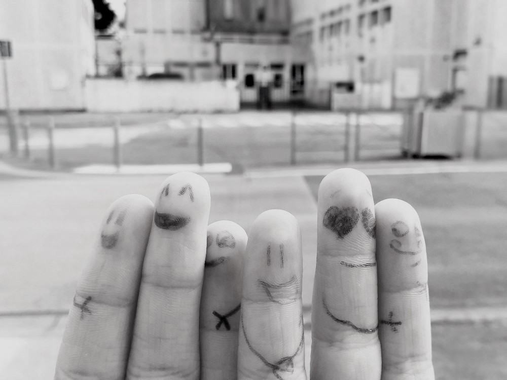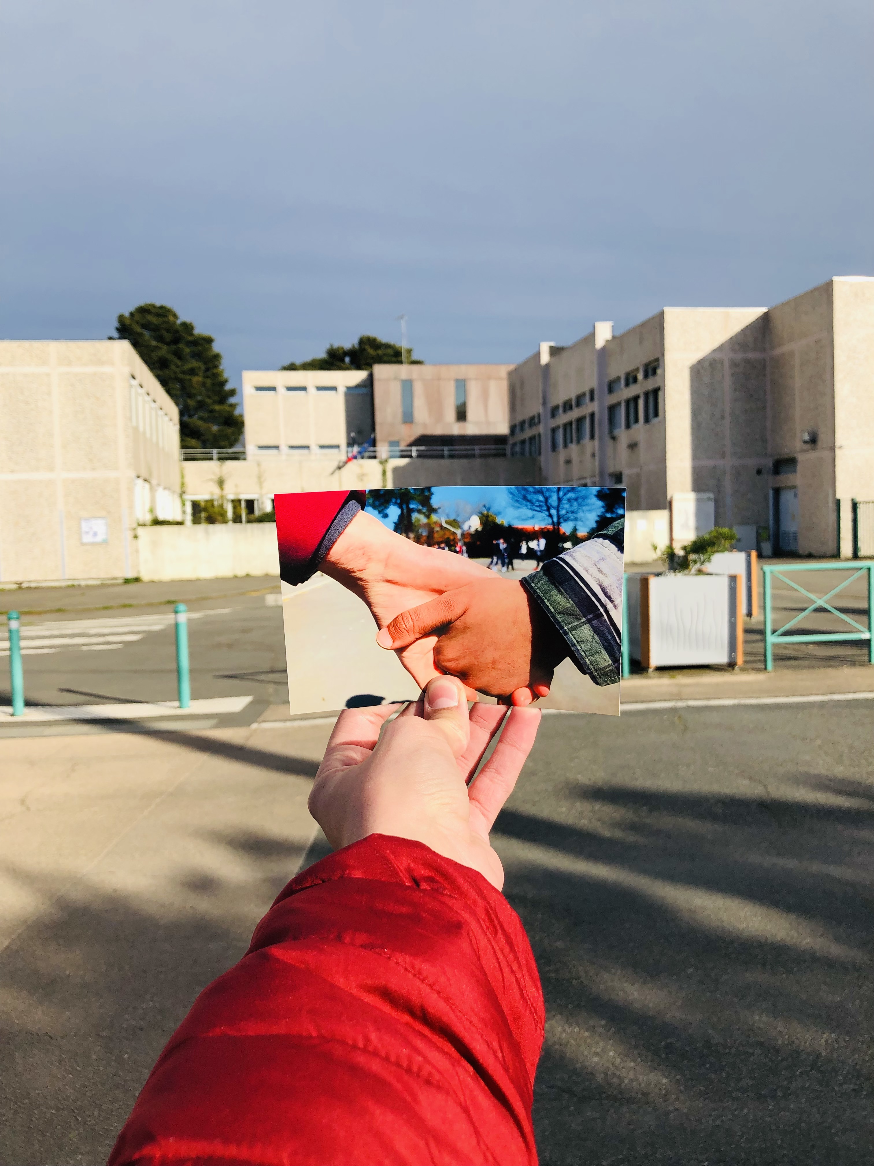 J’ai réalisé une première photo qui se trouve au premier plan, grâce au cadrage on y observe deux élèves d’origines différentes qui se tiennent la main, une fois cette première photographie imprimée j’ai réalisé la photo finale en tenant la photo à bout de bras. En arrière-plan de celle-ci, on y voit le collège !"