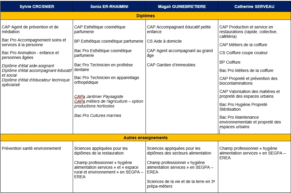 Les inspectrices et inspecteurs en charge des disciplines et diplômes de cette rubrique pédagogique sont joignables par leur adresse électronique académique ci-dessous.