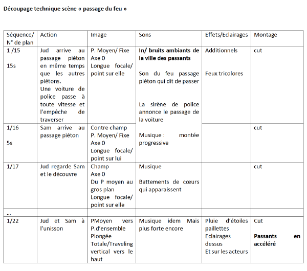 Les deux acteurs principaux devront dans un premier temps se perdre dans la foule. Puis tous deux arrivés au feu, ils devront faire passer dans leurs corps, dans leurs regards, dans les mouvements de leurs mains, tout un tas d’émotions : passer de la découverte de l’autre au coup de foudre. Le langage du corps sera donc très important. Le passage sera chorégraphié (faire appel à un chorégraphe si besoin : Marion Motin). Il faudra envisager de légers déplacements du corps, des pieds, des mains, avec des échanges de regards, puis avec des regards au même moment vers la pluie scintillante ; pour enfin traverser la rue, et se frôler délicatement les mains sans se retourner. Cela devra être un travail artistique fortement tourné sur le langage du corps, ce que l’on ne voit pas dans cette séquence de Michael Dudok de Wit avec ses choix de plans larges, plans d’ensemble ou généraux.
