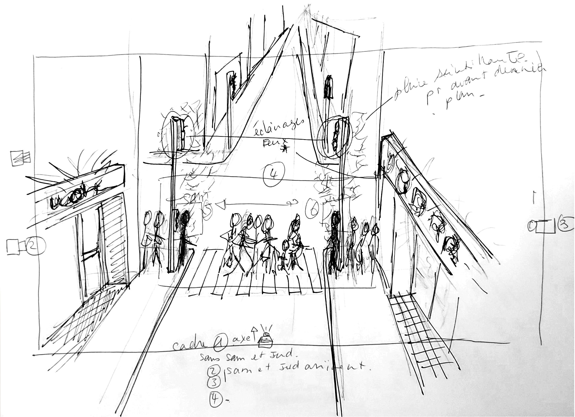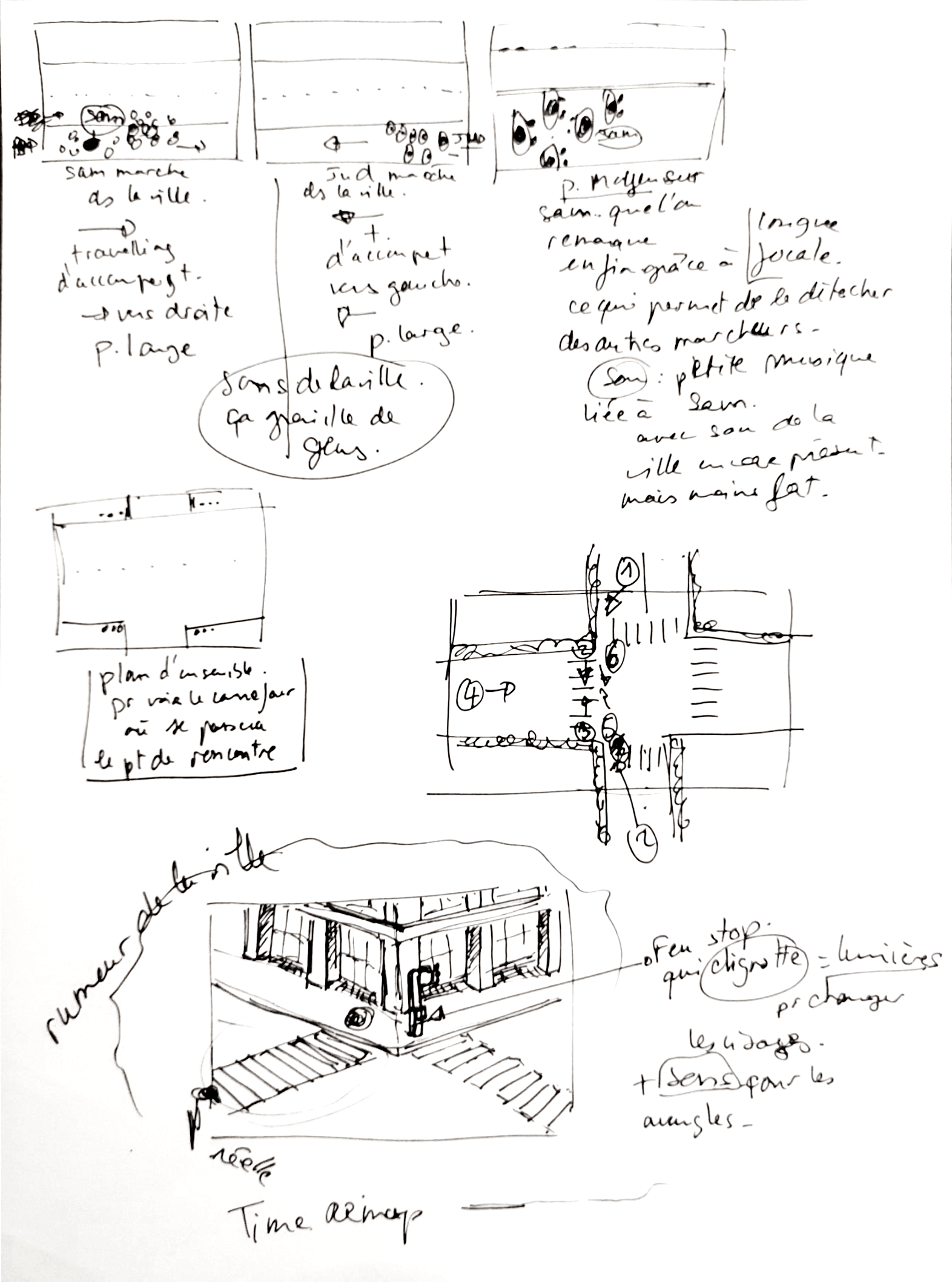 Pour les éclairages, le début de la séquence commencerait à la tombée de la nuit pour que les vitrines très colorées des magasins ajoutent de la couleur aux plans et éclairent « artificiellement » les passants. Lorsque les deux acteurs arrivent au passage piéton, il fera complétement nuit. Ainsi je pourrais travailler les éclairages artificiels (éclairages additionnels) et déjà présents dans l’environnement. Peut-être qu’il faudrait un chef opérateur et un chef décorateur afin d’installer d’autres lumières, comme des enseignes lumineuses qui clignotent ou des spots directionnels avec gélatines de couleurs sur leurs visages. Il faut qu’il y ait aussi un feu tricolore pour éclairer mes deux protagonistes alternativement et ajouter du rythme coloré aux plans et sur les visages. Cela renforcerait ainsi leurs émotions fortes lors de cette rencontre, et l’oscillement lumineux viendrait traduire comme des battements de coeur leur émois.