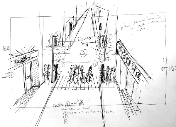 J’ai envie comme dans le film de Michael Dudok de Wit de faire place au « paysage », même si celui-ci est urbain. Un peu à la façon de Cléo de 5 à 7 lors de ses déambulations, les premières images seront traitées de façon documentaire en longue focale avec un travelling latéral d’accompagnement pour être assez loin des deux acteurs principaux et laisser place aux mouvements de la ville. Ces premières images permettront ainsi de ne pas tout de suite identifier les protagonistes, de voir de la matière, du grain, de la couleur, et rester très proche des effets plastiques Michael Dudok de de Wit.