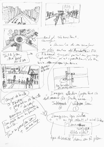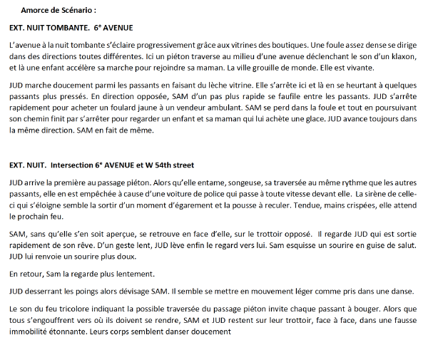 Lieu : Manhattan, sera comme un personnage. Une grande avenue où il y a beaucoup d’activités, de passages, de passants, de vitrines colorées. Un carrefour (assez gros) entre l’avenue et une petite rue. Pour cadrer les deux personnages de façon à ce qu’ils ne soient pas trop éloignés l’un de l’autre dans le cadre. J’ai choisi cette ville car je la connais bien. Et puis j’ai des images de films qui reviennent comme Taxi Driver de Martin Scorsese, ou Manhattan de Woody Allen avec des ambiances sonores particulières.