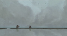 Le premier plan d’ensemble installe une scène de pêche prise dans le quotidien de la vie. Une bande de sable très fine est posée au 1/3 du cadre afin d’en dessiner un horizon, une séparation entre ciel et mer. L’homme et la femme légèrement décentrés dans le cadre y sont accroupis en position de pêche à la main, tournés l’un vers l’autre et le fils arrive dans le champ, bord cadre à droite, afin d’équilibrer la composition de la scène. Un peu à la façon d’une portée musicale, sur cette ligne de sable, une alternance vide/ plein /vide /plein/ trou d’eau /homme/trou de terre/femme/ panier/ fils, créée un rythme subtil dans cet espace presque vide de détail. Le panier déjà posé au sol annonce le plan suivant en permettant un raccord mouvement avec un changement d’axe. D’observateur lointain on passe à plus prêt. On retrouve le fils en plan moyen qui s’affaire lui aussi à la pêche mais il sortira du champ vers la droite avec une bouteille à la main, objet métaphorique de l’autre monde. La place de la nature, comme souvent dans le film, y est majoritaire. Le son des oiseaux hors champ et de la mer ajoute à cette sensation de nature très présente où l’homme se trouve inscrit dans le paysage physiquement. Les oiseaux ont rarement été aussi bruyants depuis le début du film. La mère, en plan moyen, se retrouve isolée sur un banc de sable. Le son des oiseaux se fait plus présent ce qui amènera la mère à regarder le ciel et les oiseaux dans un raccord regard. C’est elle, la première, qui pressent quelque chose. Au plan moyen suivant, le fils qui s’éloigne de ses parents, poursuit son chemin vers l’intérieur des terres, lui aussi jette un regard vers le haut. Rien ne laisse présager la suite de ce qui va arriver, sauf si l’on prête attention aux signes comme le font déjà la mère et le fils. Les plans sont sombres, presque uniquement dans des nuances de gris légèrement verts. Ces plans à la fois paisibles et sombres font monter une peur étrange, une sensation d’un faux calme d’avant la tempête.